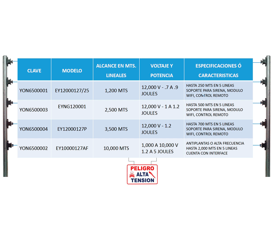 El mejor equipo y rentable sistema de protección perimetral para proteger casas, condominios, bodegas, plazas comerciales, instituciones educativas, empresas, predios y cercados de ganado. Es un sistema disuasivo mediante letreros de alto voltaje y repulsivo ya que genera una descarga de 12,000 voltios sin dañar al intruso, se ofrece un equipo confiable, eficiente y fácil de instalar.